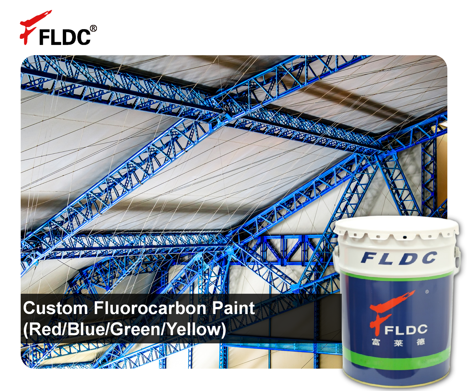 The FLD-Custom Fluorocarbon Paint (Red/Blue/Green/Yellow) is a high-performance, two-component fluorocarbon coating offering vibrant red, blue, green, and yellow color options tailored to specific project requirements. Based on FEVE (fluoroethylene vinyl ether) resin technology, this topcoat delivers exceptional weatherability, UV resistance, and long-term color and gloss retention – even in challenging exterior environments. The custom color formulation allows for precise matching to architectural, industrial, or safety color specifications. This coating provides outstanding resistance to salt spray, industrial pollutants, acid rain, and moisture, ensuring that the vibrant colors remain bright and durable for decades.