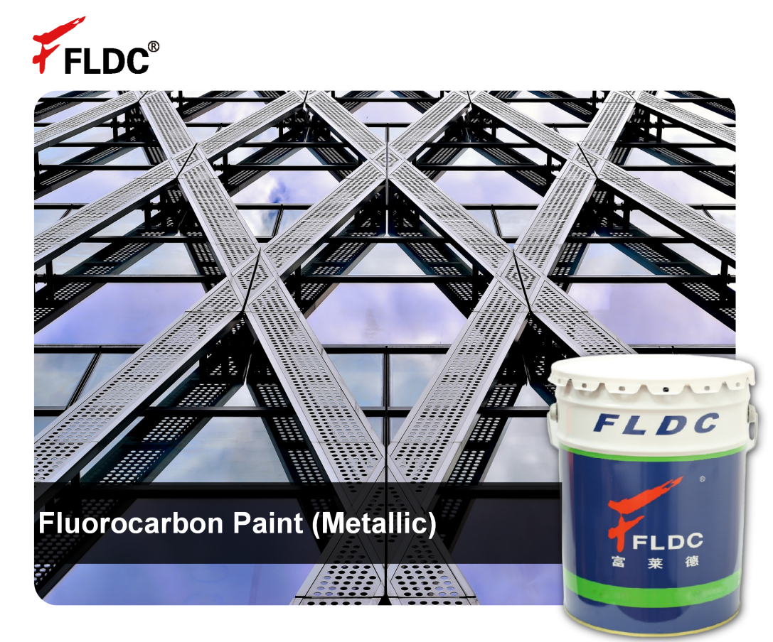 The FLD-Fluorocarbon Paint (Metallic) is a high-performance, two-component fluorocarbon coating formulated with fine metallic pigments to deliver a premium, lustrous finish with exceptional durability. Based on FEVE (fluoroethylene vinyl ether) resin technology, this topcoat combines outstanding weatherability, UV resistance, and long-term color and gloss retention with the aesthetic appeal of metallic finishes – available in silver, gold, bronze, and custom metallic shades. The reflective metallic surface provides a modern, high-end look for architectural and industrial applications while maintaining the superior corrosion resistance, anti-graffiti properties, and easy-clean characteristics expected from fluorocarbon coatings.